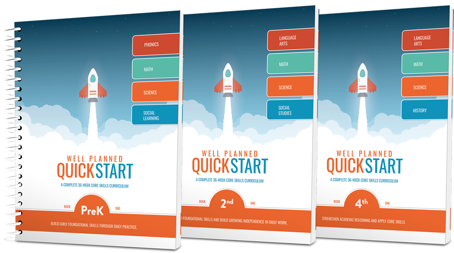 Well Planned QuickStart provides a complete 36-week, 180-day core skills curriculum for math, language arts, science, and social learning. Daily lessons are clear, concise, and consistent, making it easy to keep learning on track without overwhelm. Designed for both home and classroom use, QuickStart keeps learning steady and engaging — helping students grow at a manageable pace without overwhelm.
