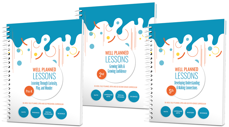 Well Planned Lessons is a comprehensive, immersive curriculum built on living books, meaningful read-alouds, hands-on exploration, and a four-year history cycle. Each grade-level guide includes weekly themes, daily lesson plans, discussion prompts, projects, nature study, and activities that make learning feel alive and connected. Whether used at home or in a classroom, these lessons foster curiosity, deepen understanding, and create memorable learning experiences—while still offering a clear, manageable structure for the teacher.